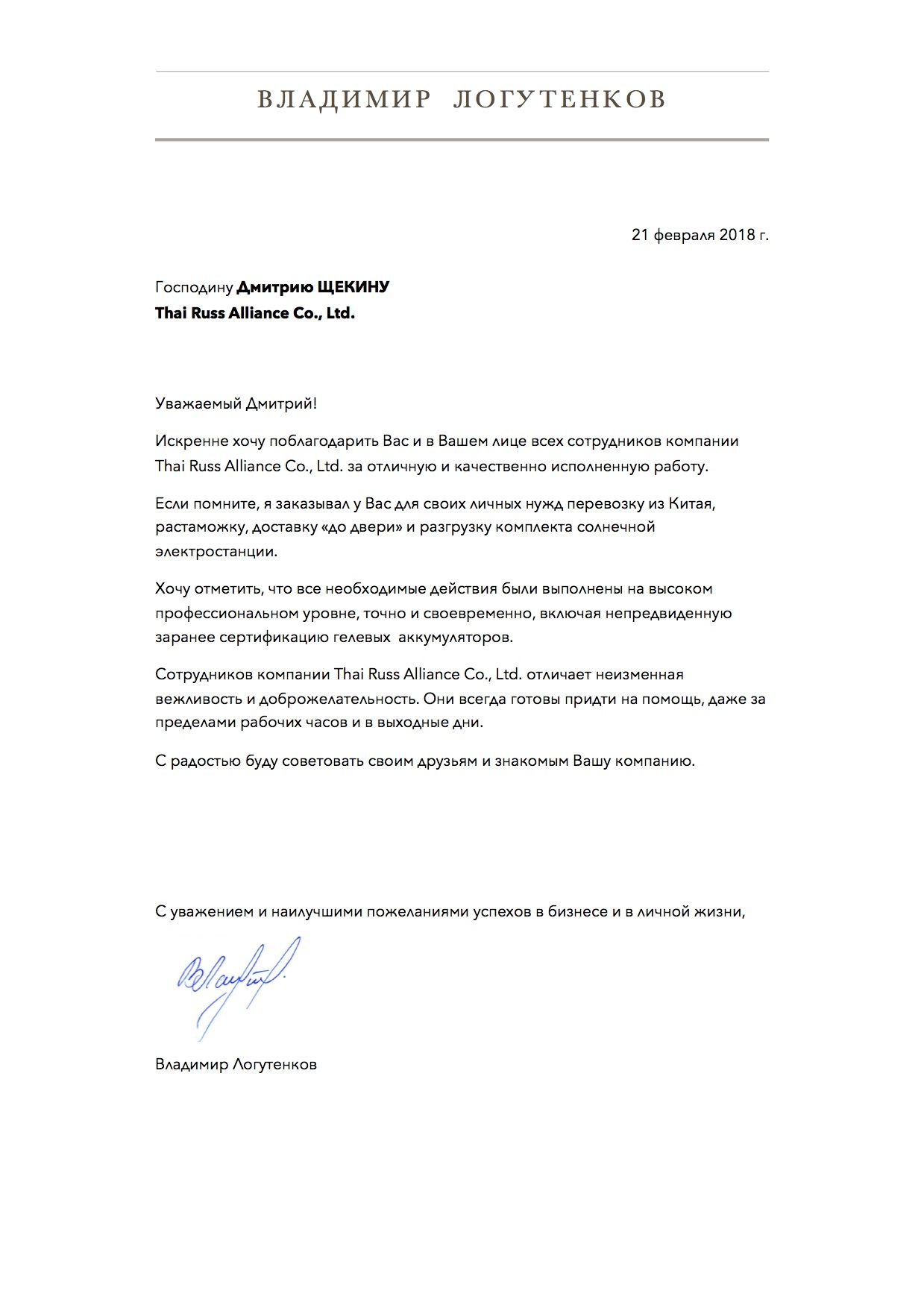 Testimonials - Customs clearance in Thailand, Deliveries from Thailand, Deliveries to Thailand, Export and Import Thailand - Russia, Logistics Thailand - Russia, Certification, Cargo delivery, Cargo transportation Russia - Thailand, Production and suppliers in Thailand - Thai Russ Alliance